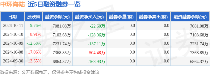 中环海陆融资融券信息数据显现,融资方面,当日融资买入747.06万元,融资归还769.66万元,融资净归还22.6万元。融券方面,融券卖出0.0股,融券归还0.0股,融券余量0.0股,融券余额0.0万元。融资融券余额7081.08万元。